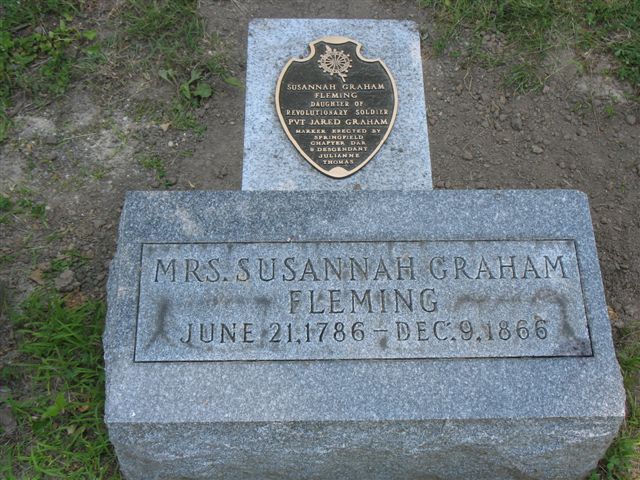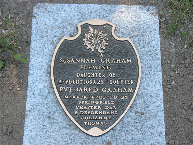 On June 21, 2008, Springfield Chapter placed a NSDAR Marker on the gravesite of Susannah Graham Fleming at Oak Ridge Cemetery in Springfield, Illinois. Susannah was born June 21, 1786, in Pickaway County, Ohio, and died December 9, 1866. Susannah was born to Jared and Jane (Jenny) Graham Sr. Her father was a Private in the 8th Class under Captain James Irvins, Cumberland County, Pennsylvania Militia, during the American Revolution. Susannah was married to Ferguson Fleming and lived in Ohio before moving to Sangamon County, Illinois. She is buried in Block 14 of Oak Ridge Cemetery, Springfield, Illinois. Please click on the images for a larger view.